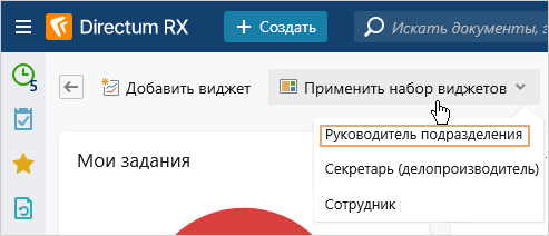 В результате в проводнике системы появится новый набор виджетов, который будет доступен для пользователей, входящих в роль «Руководители подразделений».