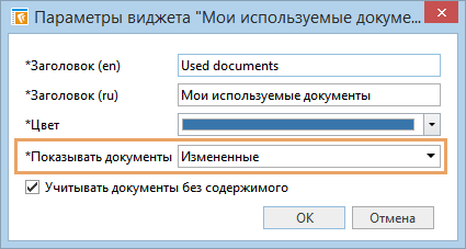 •«Мои используемые документы», разработан в новом решении. У виджета есть параметр-перечисление Показывать документы. Возможные значения параметра: Все, Измененные, Просмотренные. По умолчанию отображается информация по всем документам. Необходимо, чтобы в новом наборе в виджете отображалась информация только по документам, которые были открыты для изменения;