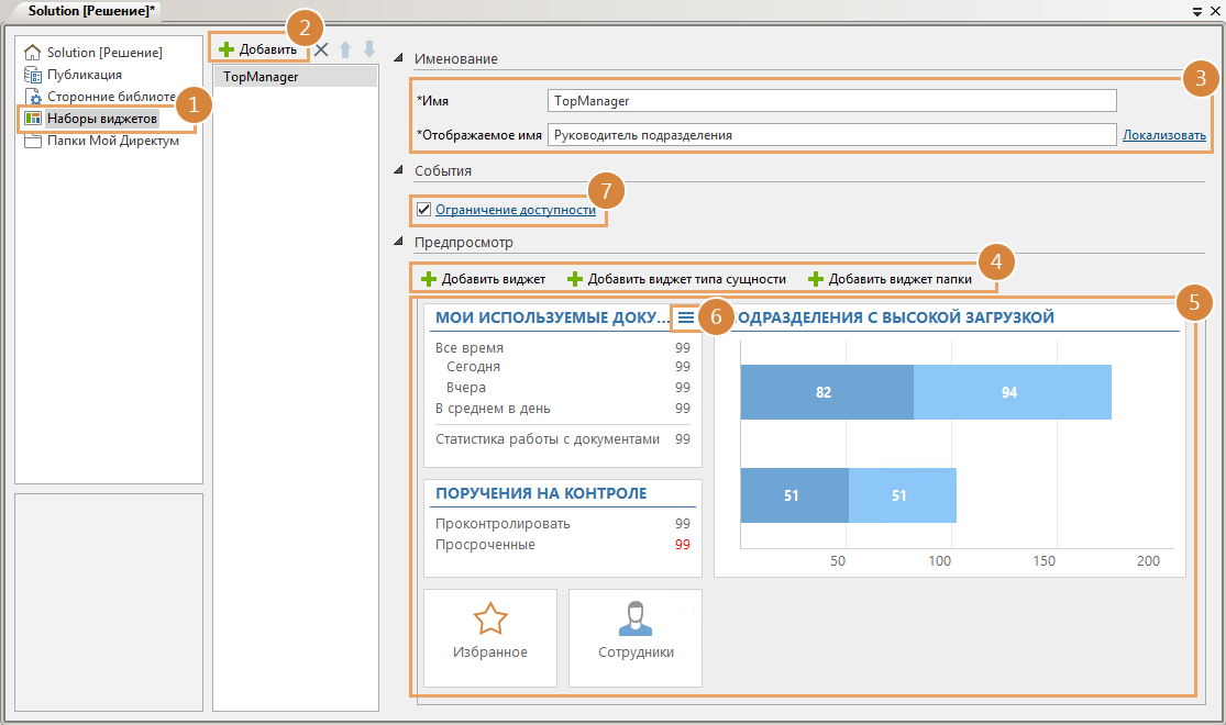 Важно. Если обработчик события Ограничение доступности не задан, то набор виджетов будет доступен для выбора всем пользователям.