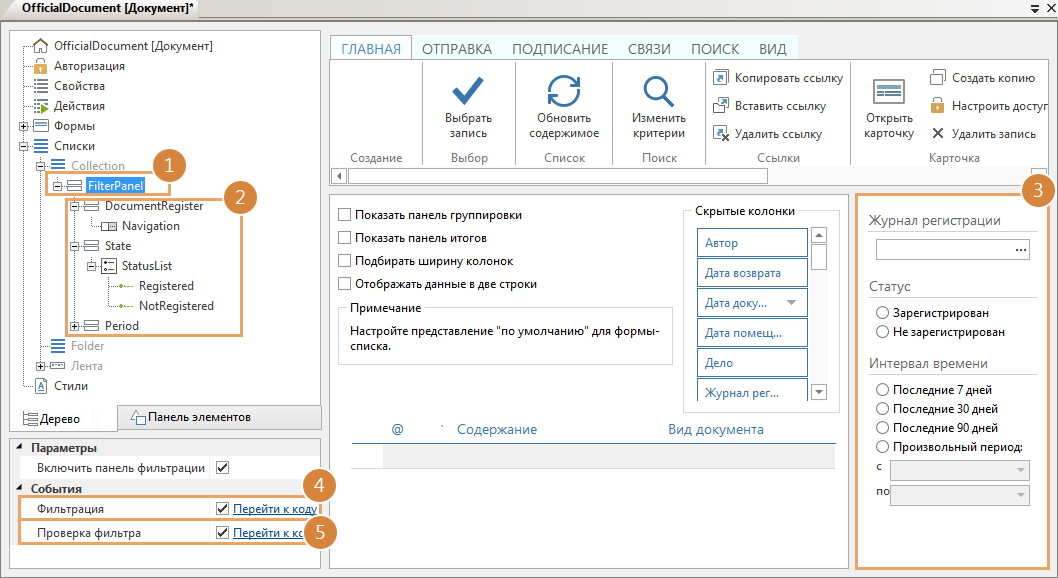 1.В дереве типа сущности последовательно раскройте узлы «Списки», «Collection» и выделите узел «FilterPanel».