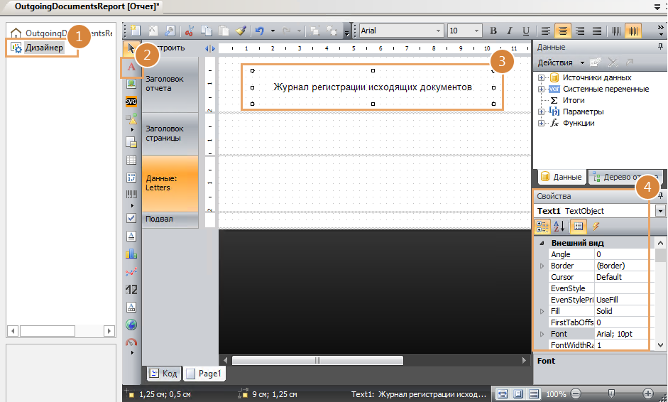 Объект создается автоматически при перемещении на макет страницы системных переменных, полей источников данных, параметров отчета и функций из окна «Данные». Также объект можно создать с помощью кнопки Текст на панели объектов в редакторе отчета: