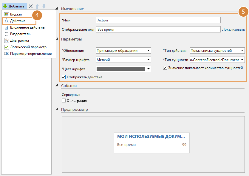•Показ списка сущностей. При нажатии на действие в виджете откроется список сущностей того типа, который указан в поле *Тип сущности. При необходимости список сущностей можно отфильтровать с помощью события «Фильтрация»;