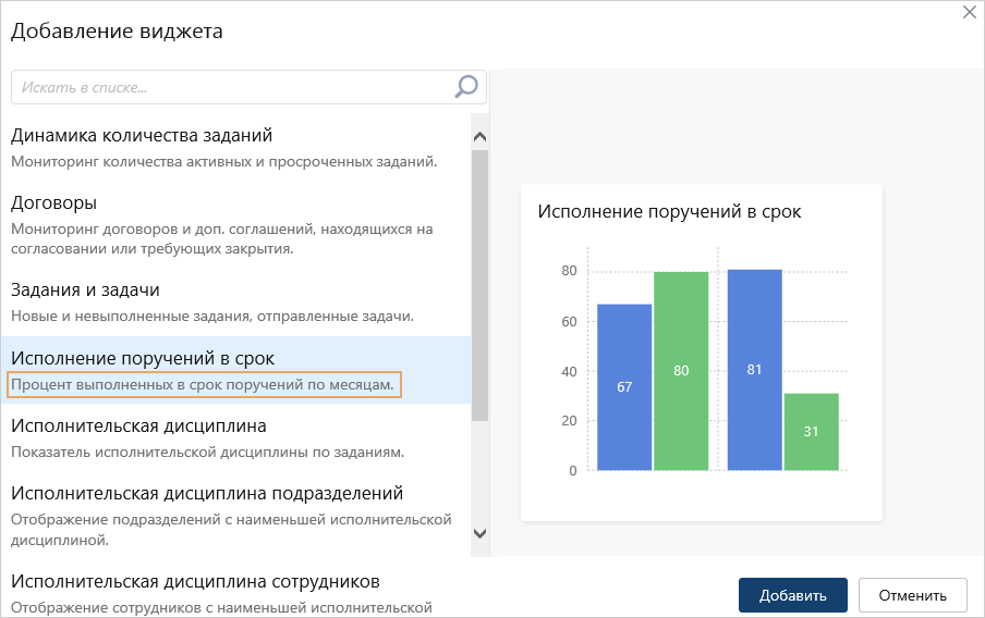 Отображать виджет. Добавленный виджет доступен для выбора в окне добавления виджетов в Directum RX. Снимите флажок, если необходимо скрыть виджет.
