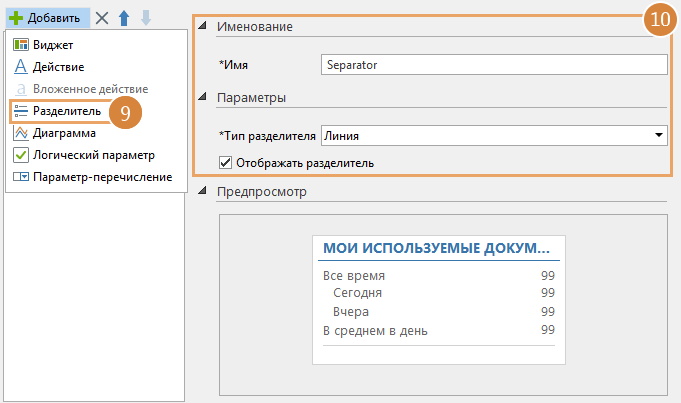 9.Чтобы отделить действия «Все время», «Сегодня», «Вчера» и «В среднем в день» от действия «Статистика работы с документами», добавьте разделитель. Для этого в списке элементов нажмите на кнопку Добавить и выберите пункт Разделитель.