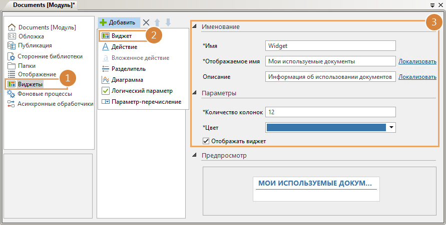 *Имя виджета. Должно быть уникальным в рамках одного модуля, состоять из букв латинского алфавита и цифр.
