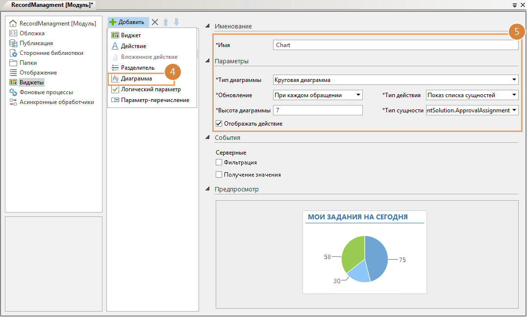 4.Добавьте в виджет диаграмму. Для этого нажмите на кнопку Добавить и в выпадающем списке выберите пункт Диаграмма.