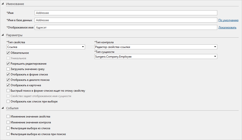 3.В редакторе созданного типа документа в узле «Свойства» добавьте свойство Адресат.