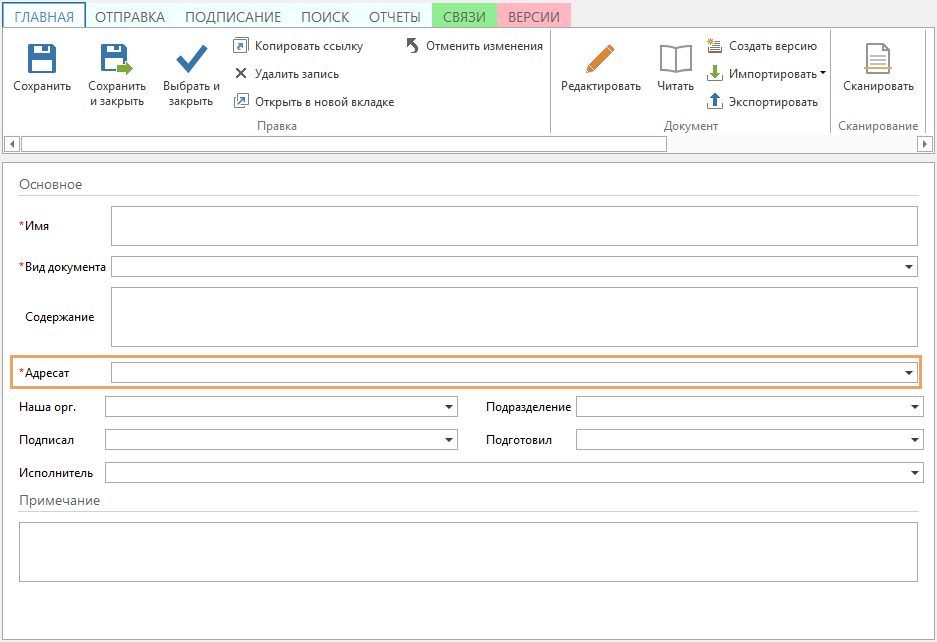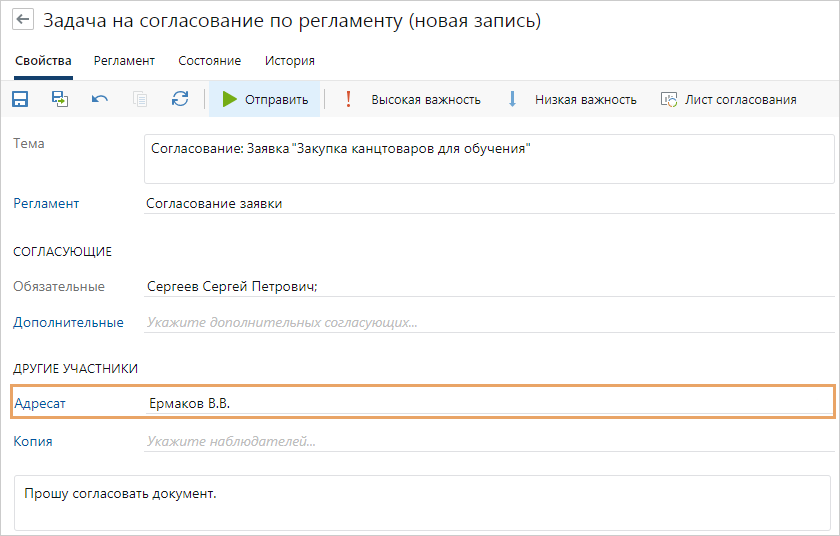 Предположим, нужно создать новый тип документа «Заявка» (Request), в его карточку добавить поле Адресат. При отправке документа данного типа на согласование по регламенту поле Адресат в задаче должно заполняться значением из документа.