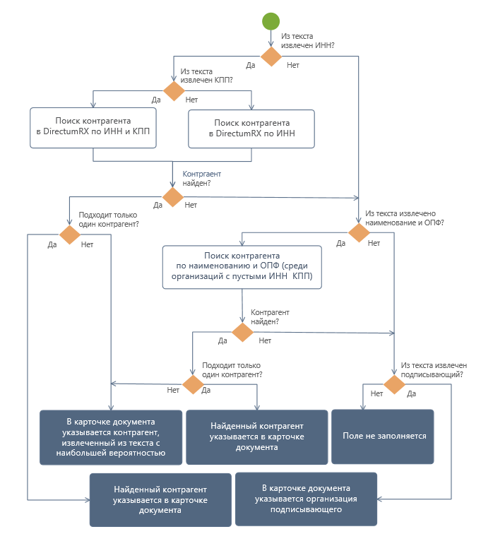 При поступлении документа сервисы Directum Ario по настроенным правилам извлекают из текста информацию об организациях: ИНН, КПП, наименование и организационно-правовую форму (ОПФ). Далее Directum RX вычисляет контрагента, применяя алгоритмы точного поиска записей: