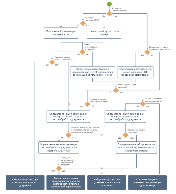 Если организация сотрудника соответствует одной из извлеченных из документа, то она указывается в карточке документа. Иначе в карточке указывается наша организация, для которой определен подписывающий (адресат). Если подписывающий (адресат) не определен, то указывается первая наша организация, извлеченная из документа с наибольшей вероятностью.