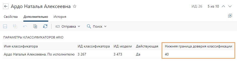 Минимальная вероятность классификации задается в записи справочника виртуального помощника на вкладке «Дополнительно» в табличной части «Параметры классификаторов Ario» в столбце Нижняя граница доверия классификации: