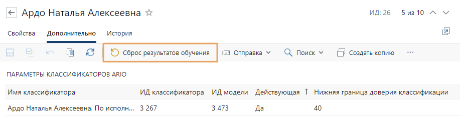 Примечание. Кнопка Сброс результатов обучения доступна администратору системы, когда у виртуального помощника есть обученная модель классификации и в табличной части «Параметры классификаторов Ario» заполнено поле ИД модели.