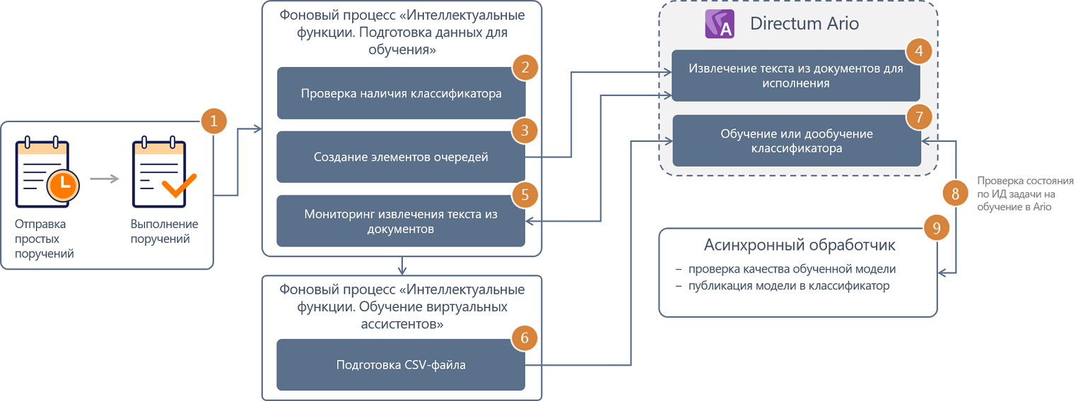 Фоновый процесс «Интеллектуальные функции. Обучение виртуальных ассистентов» отправляет запрос на обучение классификатора в сервисы Directum Ario, которые ставят набор полученных данных в очередь и передают в систему идентификатор задачи на обучение.
