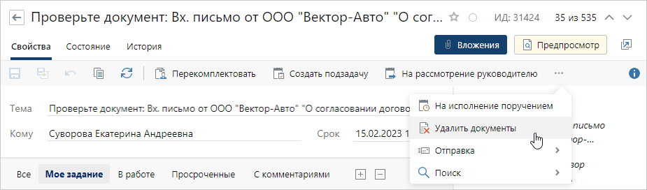 Документы можно удалить из задания, если верификация еще не завершена, то есть в карточке документа в поле Верификация установлено значение В процессе.