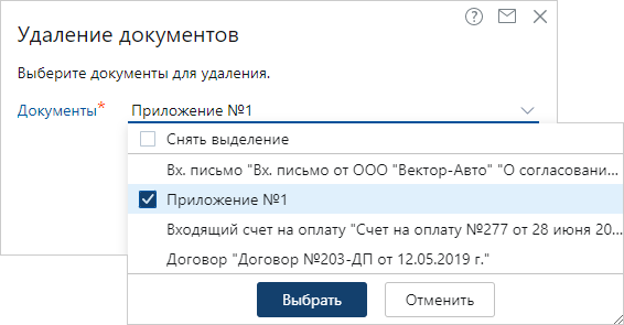 2.В открывшемся окне в выпадающем списке Документы выделите документы, которые нужно удалить, и нажмите на кнопку Выбрать.