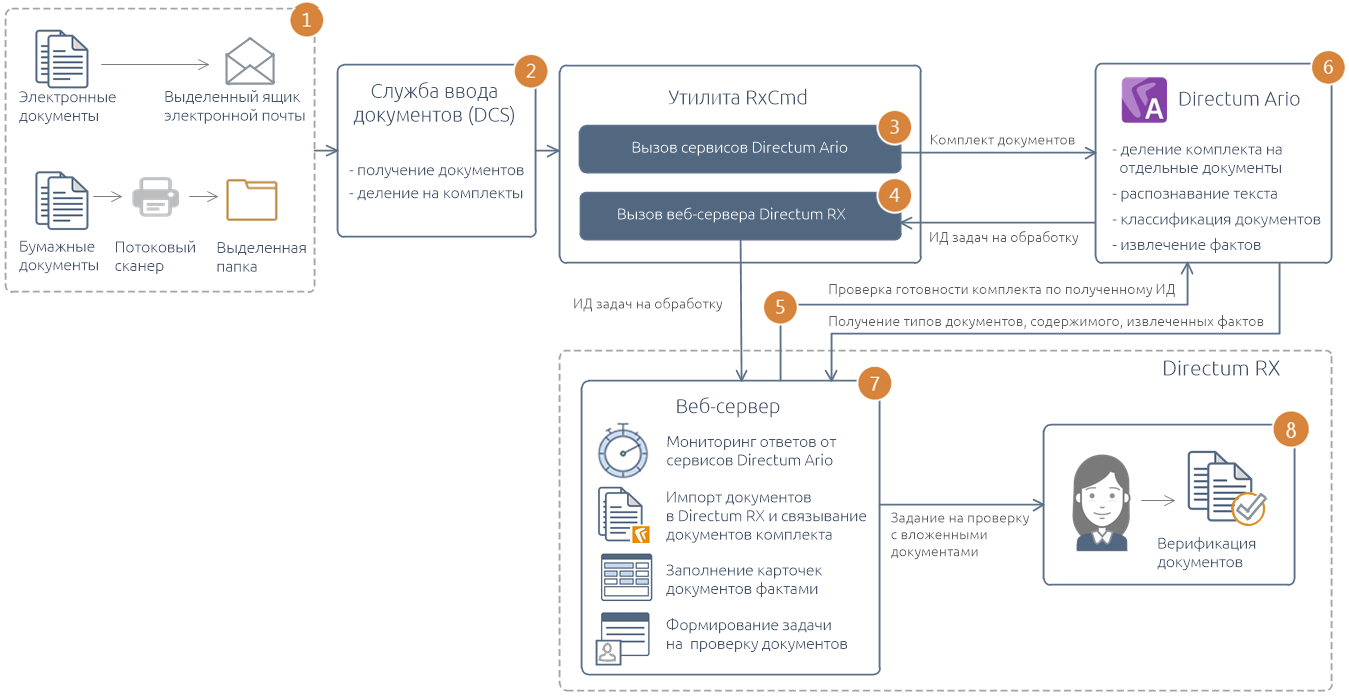 4.Получение ИД задач на обработку документов и вызов веб-сервера Directum RX. Сервисы Directum Ario ставят пакет документов в очередь и передают утилите RxCmd идентификаторы задач на обработку. ИД формируется на каждый документ комплекта. Затем утилита RxCmd обращается к веб-серверу через сервис интеграции и передает полученные ИД.