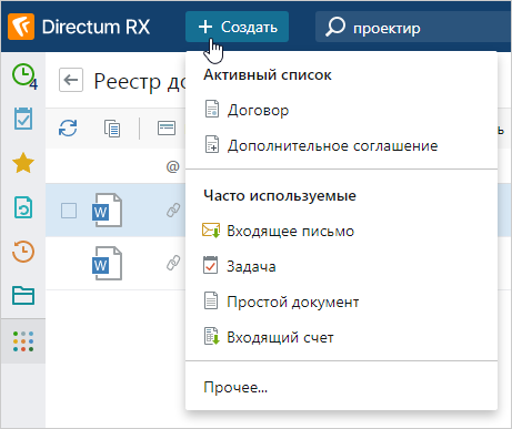 При нажатии на кнопку выберите создаваемый объект. Варианты выбора в группе «Активный список» состоят из объектов, которые доступны для создания в текущем списке. Например, в реестре договоров можно создать договор и дополнительное соглашение. В группе «Часто используемые» – типы объектов, которые вы создавали недавно и которые не относятся к текущему списку: