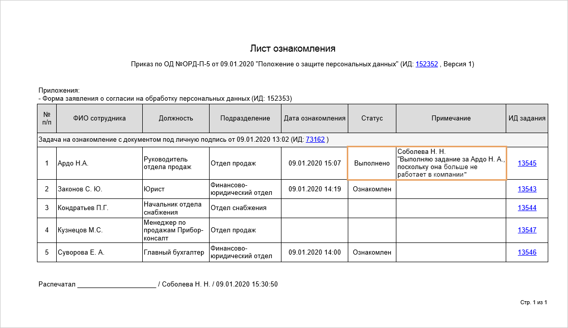 В колонке Примечание указывается сотрудник, который выполнил задание по замещению, и комментарий, который он оставил. На основании комментария примите решение, считать сотрудника ознакомленным с документом или нет. Подробнее см. пример формирования отчета для итогового контроля при ознакомлении в электронном виде.