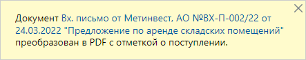 В результате создается новая версия документа в формате PDF с отметкой о поступлении. В отметке содержатся название нашей организации, номер и дата регистрации письма: