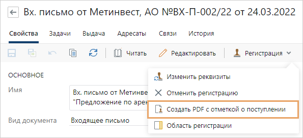 1.В карточке документа на панели действий в выпадающем списке Регистрация выберите пункт Создать PDF с отметкой о поступлении: