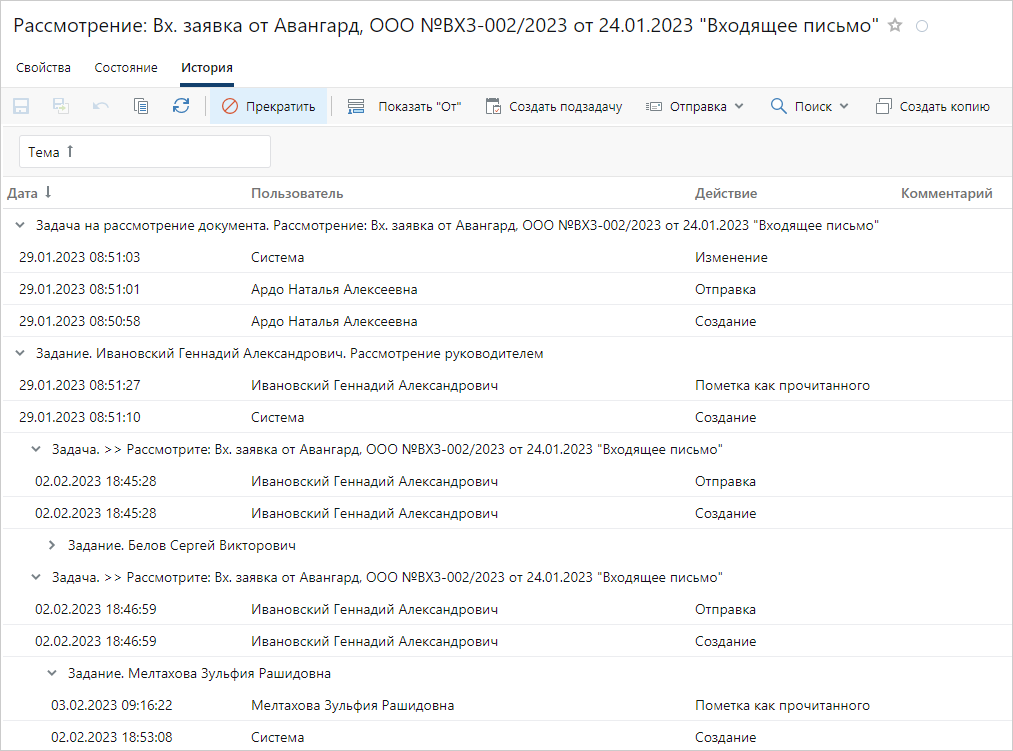 В карточке задачи отображается история заданий, уведомлений и подзадач по этой задаче. Записи группируются по теме. Все группы, кроме истории задачи, по умолчанию свернуты. Если из задания или задачи созданы подзадачи, то их история также сгруппирована и отображается в группе ведущего задания или задачи соответственно. Примечание. В карточке задания и уведомления отображается только его история. В истории работы с задачами фиксируются действия, для которых не требуются пояснения в виде комментариев: Создание, Отправка, Отправка на доработку, Просмотр, Рестарт, Прекращение, Завершение, Продление срока. А также действия с дополнительной информацией: