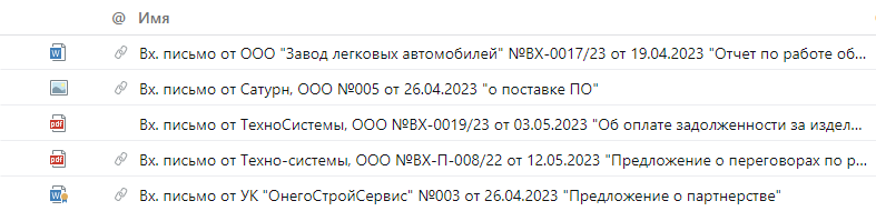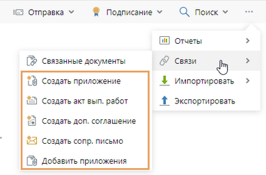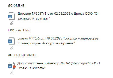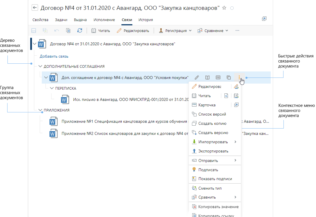 В системе можно связывать документы между собой для добавления смысловых взаимосвязей и быстрого перехода к связанным документам. Например, с договором можно связать весь необходимый комплект документов: приложения, дополнительные соглашения, акты и переписку по договору.