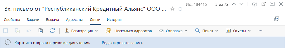 карточка документа открывается в режиме просмотра. Если в нее нужно внести изменения, нажмите на ссылку Редактировать запись.