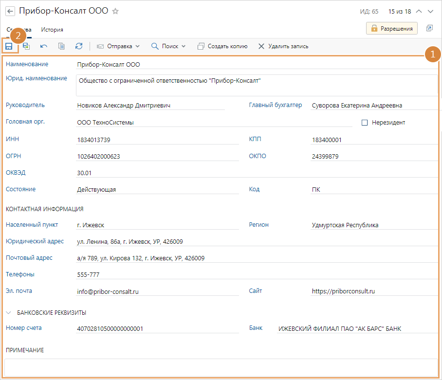Примечание. При сохранении записи справочника автоматически добавляется запись в справочник «Организации» При открытии такой записи в справочнике Организации поля карточки нашей организации доступны только для просмотра.