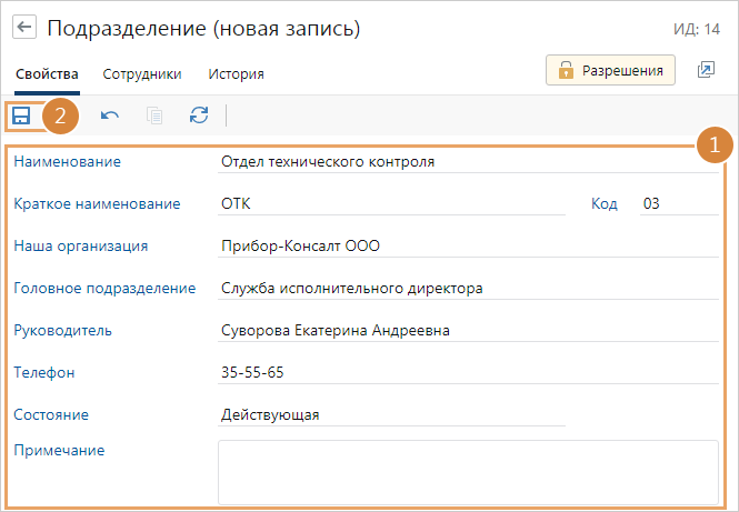Совет. Рекомендуется создавать сначала головные подразделения, а затем подчиненные, чтобы при заполнении полей можно было указать головное подразделение.