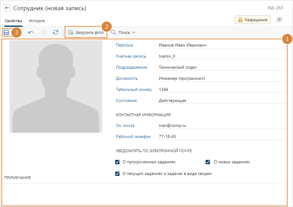 *Персона. Связь с персональной информацией о сотруднике. Если в справочнике Персоны нет подходящей записи, создайте новую. Учетная запись, предназначенная для входа в систему. Для выбора доступны только свободные учетные записи, не связанные с другими сотрудниками. Если в справочнике Учетные записи нет подходящей записи, создайте новую. Если сотрудник не работает с системой, то для него не нужно создавать учетную запись. *Подразделение, в котором работает сотрудник. Используется, например, для автоматического определения непосредственного руководителя, которому отправляется документ на согласование по регламенту. Если согласно структуре компании сотрудник не состоит в каком-либо подразделении, создайте «виртуальное» подразделение с говорящим названием. Например «Служба генерального директора». Примечание. При заполнении поля *Подразделение сотрудник автоматически попадает в список всех сотрудников, которые работают в данном подразделении. Список отображается в карточке подразделения на закладке «Сотрудники». Если сотрудник одновременно работает в нескольких подразделениях, вручную добавьте его в списки сотрудников в карточках остальных подразделений. Если заполнить должность сотрудника, в карточке которой указано подразделение, то поле *Подразделение заполнится автоматически. Табельный номер. Уникальный номер сотрудника в пределах организации, который присваивается при приеме на работу. Должность сотрудника. Для выбора доступны записи, которые относятся к указанному подразделению, а также для которых подразделение не заполнено. Должности подчиненных подразделений не отображаются в списке для выбора. *Эл. почта и Рабочий телефон. Рабочие контактные данные сотрудника. В группе «Уведомлять по электронной почте» установите флажки: •О просроченных заданиях и О новых заданиях. В этом случае, в системе каждые 30 минут будет выполняться проверка на наличие просроченных заданий или новых непрочитанных заданий и уведомлений. Если такие задания есть, то сотруднику придут оповещения на электронную почту. Настройки рассылки задаются в фоновом процессе «Документооборот. Рассылка писем о новых и просроченных заданиях»; •О текущих заданиях и задачах в виде сводки. В этом случае сотрудник будет получать электронные письма со сводкой о заданиях и задачах в работе. По умолчанию электронные письма отправляются ежедневно. Настройки рассылки задаются в фоновом процессе «Документооборот. Рассылка писем со сводкой по заданиям и задачам в работе». По умолчанию флажки установлены. При необходимости администратор может настроить состояние флажков по умолчанию. Например, чтобы при создании новых карточек сотрудников флажки автоматически снимались. Если сотрудник назначен замещающим и для него настроено уведомление по электронной почте, то ему также приходят оповещения о новых и просроченных заданиях и текущих заданиях и задачах в виде сводки для отсутствующего сотрудника. Оповещения приходят вне зависимости от настроек, заданных в карточке отсутствующего сотрудника. Поле *Эл. почта становится обязательным для заполнения, если установлен хотя бы один из флажков в группе «Уведомлять по электронной почте». ИД внешней системы. Идентификатор контрагента во внешней системе, если для нее настроена интеграция с Directum RX. По