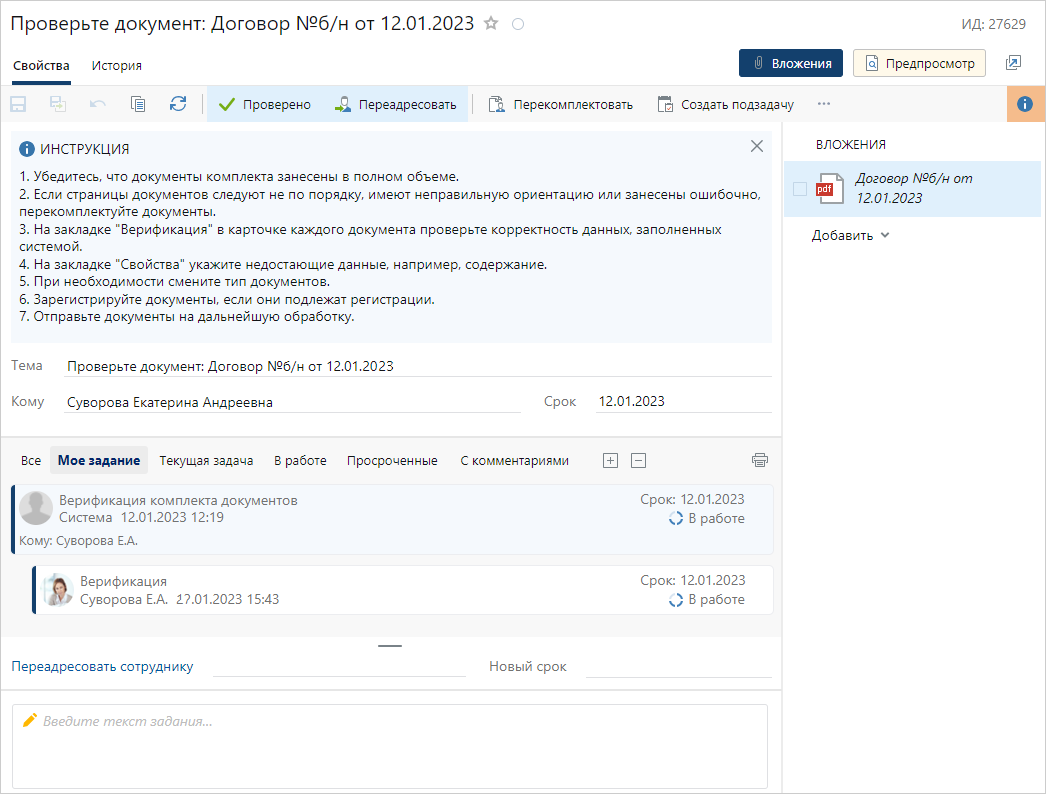 Если за обработку документов отвечает другой сотрудник, например секретарь или ответственный за договор, переадресуйте задание. Для этого в карточке задания заполните поля: Переадресовать сотруднику. Указанный сотрудник получит задание. Новый срок задания на верификацию документов, по умолчанию – 4 часа. На панели действий нажмите на кнопку Переадресовать. 2.Проверьте, что вложенный комплект занесен в систему в полном объеме. 3.Выполните верификацию документов, вложенных в задание, и зарегистрируйте их. 4.Отправьте документы на согласование по регламенту. |