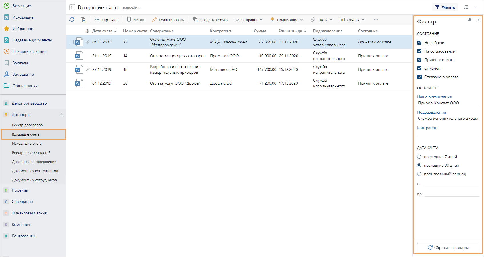 Используйте список для поиска входящих счетов по заданным параметрам с помощью панели фильтрации. Например, можно посмотреть список всех входящих счетов, которые находятся на согласовании и получены от определенной организации.