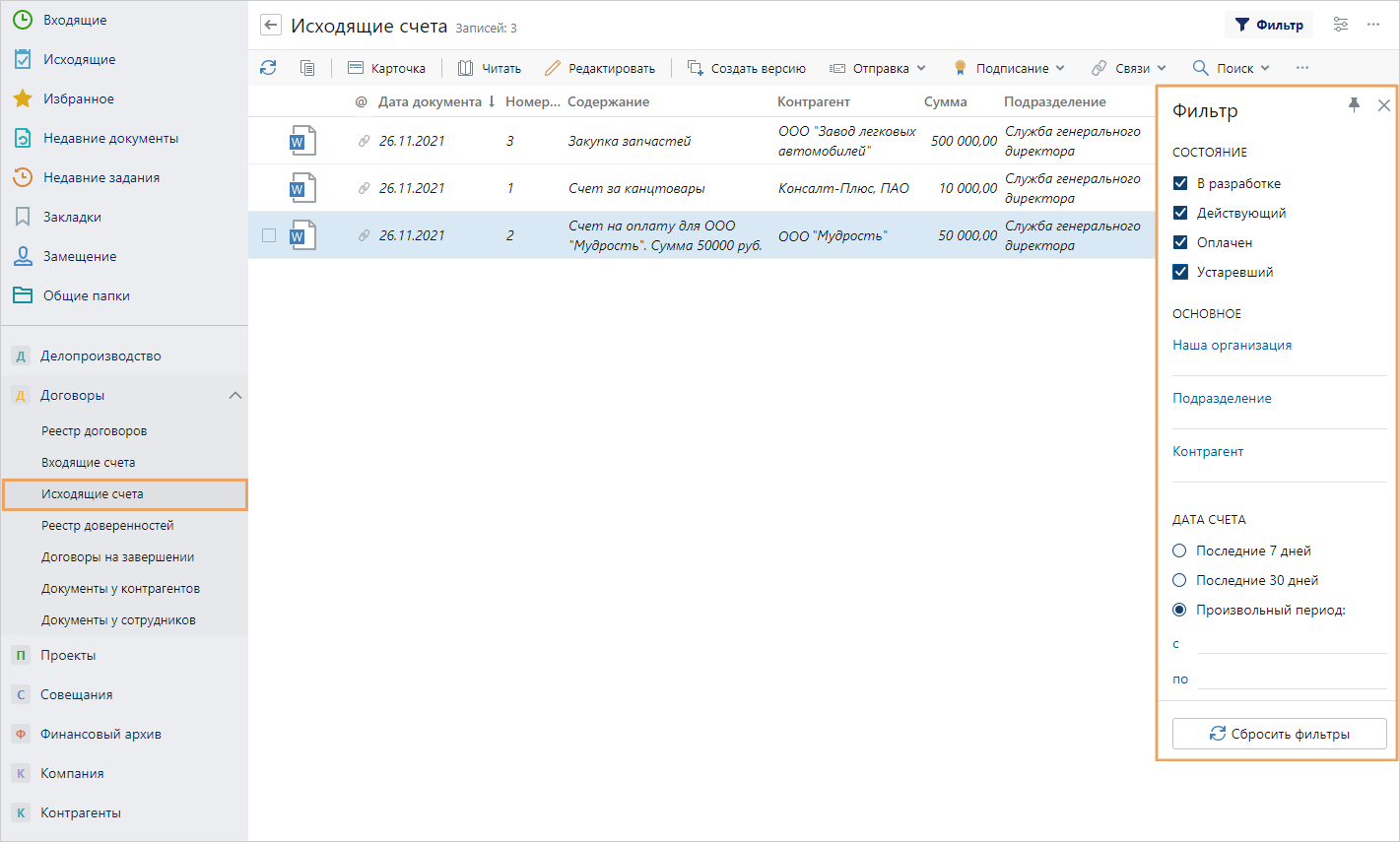 Используйте список для поиска исходящих счетов по заданным параметрам с помощью панели фильтрации. Например, можно посмотреть список всех исходящих счетов, оплаченных определенной организацией.