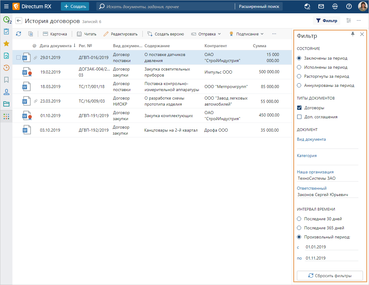 Используйте список для поиска договоров по заданным параметрам с помощью панели фильтрации. Например, можно отслеживать изменение состояния договоров за определенный период, у которых сотрудник является ответственным.