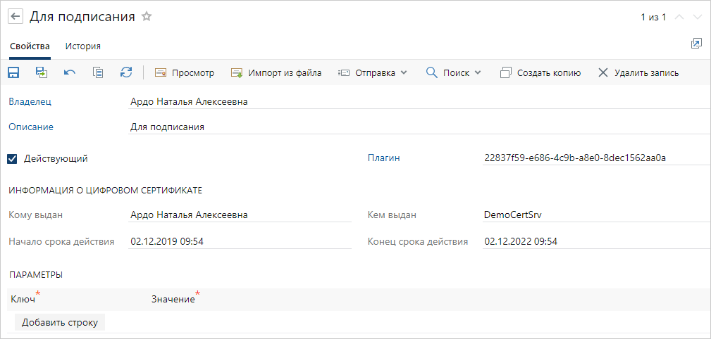 Примечание. Поля *Ключ и *Значение не нужно заполнять, в настройке стандартных плагинов подписания они не используются.