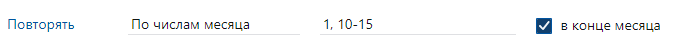 •«По числам месяца». Процесс запускается в указанные числа месяца. Числа перечисляются через запятую, если нужно указать промежуток чисел, то через дефис. Если нужно, чтобы процесс запускался в последний день месяца, установите флажок в конце месяца. Например, необходимо, чтобы процесс запускался в первый день месяца, в промежуток между 10 и 15 числами и в последний день месяца: