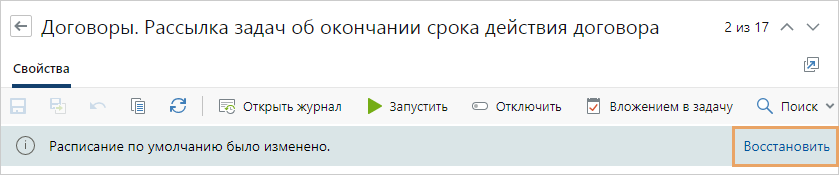 После изменения расписания в карточке фонового процесса появится сообщение о том, что расписание, заданное по умолчанию, было изменено. При необходимости вы можете восстановить первоначальные настройки. Для этого в тексте сообщения нажмите на ссылку Восстановить и сохраните карточку фонового процесса