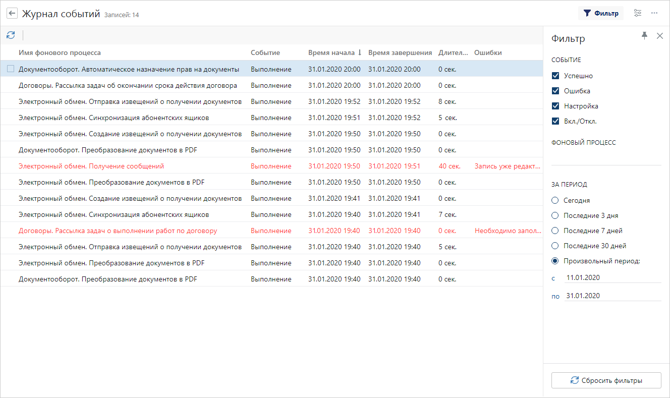 В журнале записываются и хранятся все события фоновых процессов: запуск, отключение, выполнение, изменение расписания, ошибки в работе процессов и др. С помощью журнала вы можете отслеживать хронологию выполнения событий по определенному процессу. Регулярный просмотр журнала позволит оперативно выявлять ошибки в выполнении фоновых процессов.