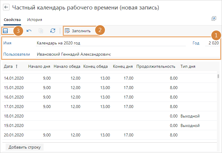 2.Заполните поля по аналогии с календарем рабочего времени.