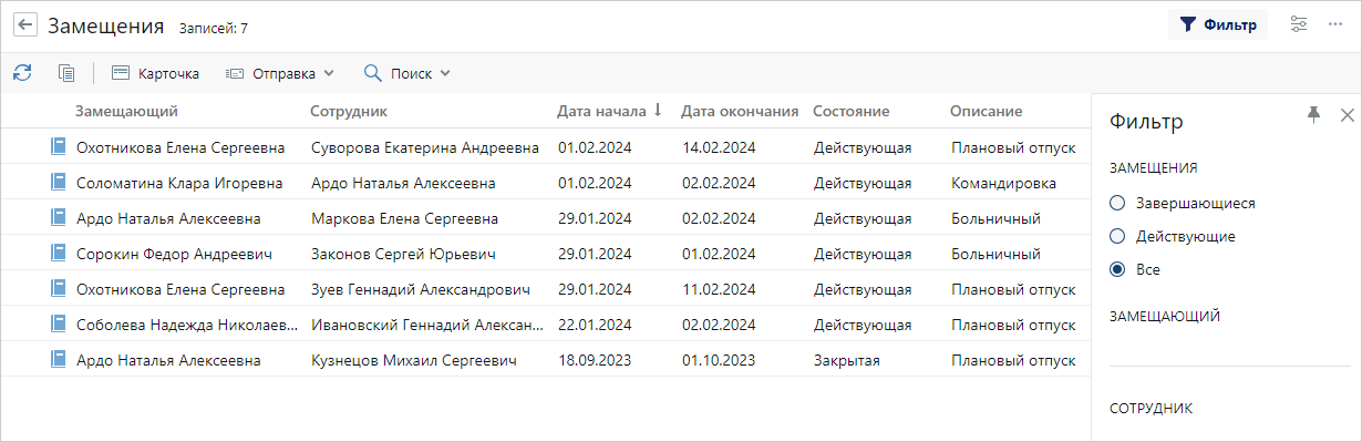 Чтобы найти замещения по заданным параметрам, воспользуйтесь панелью фильтрации. Например, отфильтруйте список так, чтобы в нем отображались все замещения, созданные для определенного сотрудника.