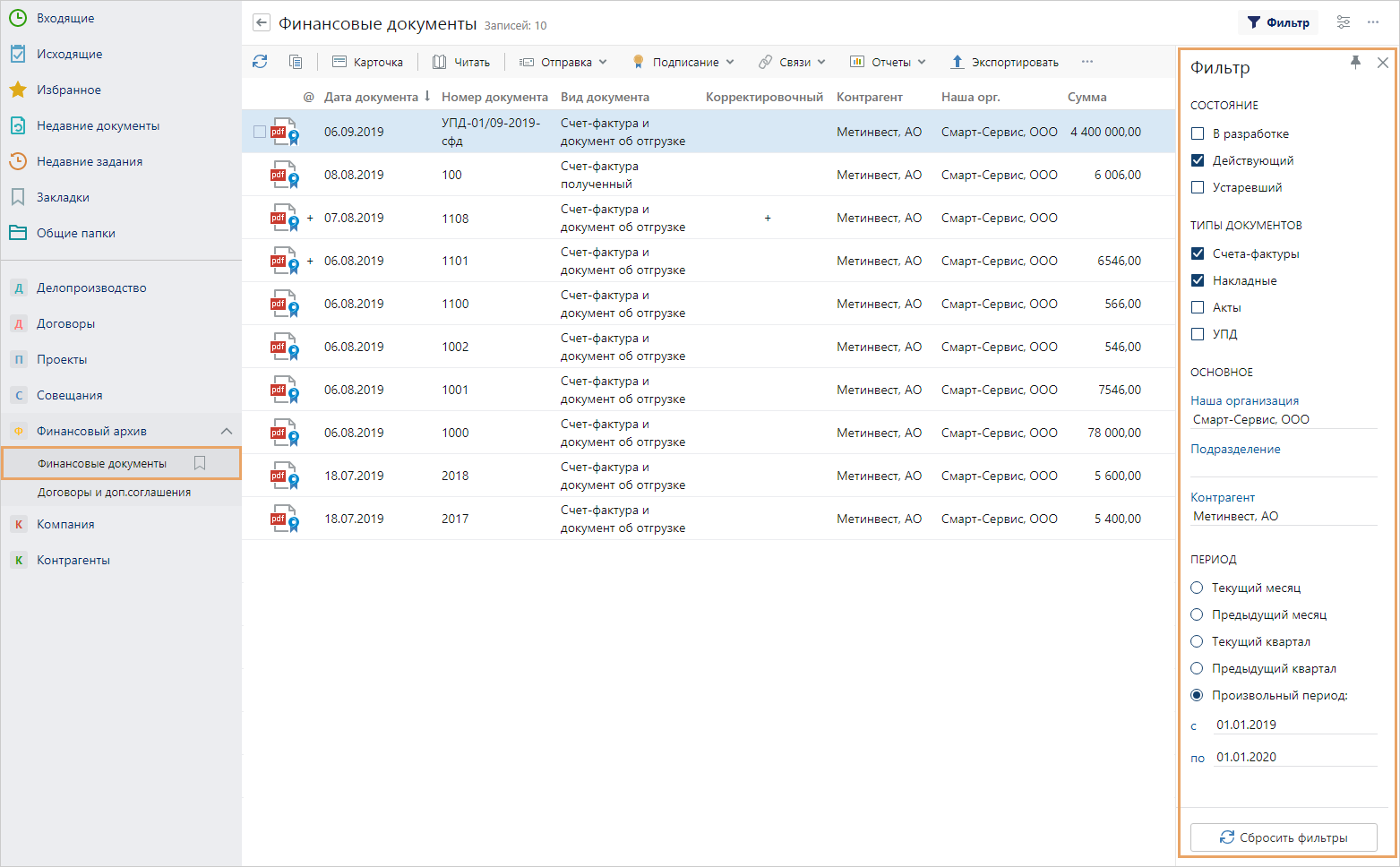 Для быстрого поиска финансово-хозяйственных документов в списке по разным параметрам используйте панель фильтрации.