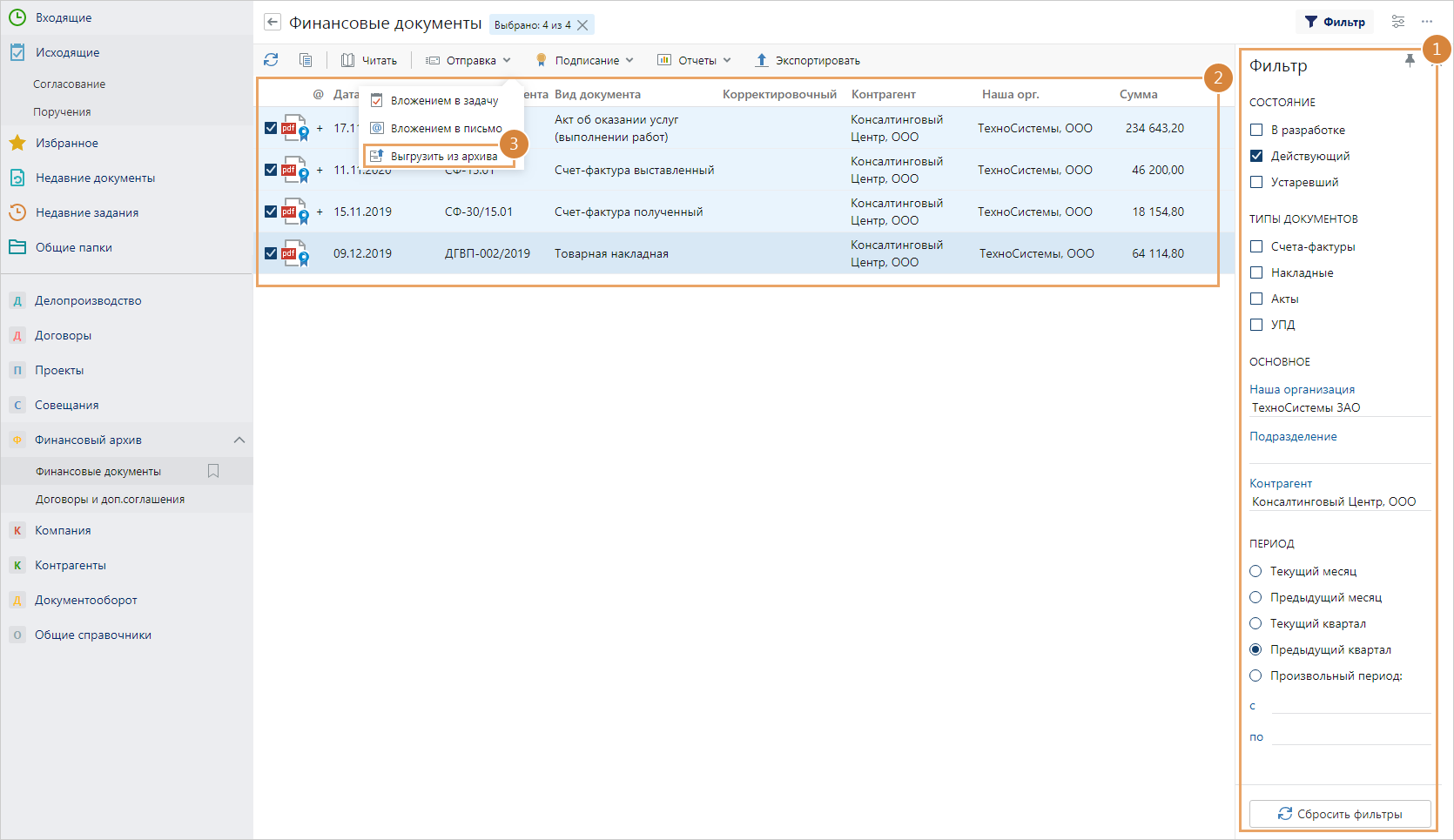 1.В списке «Финансовые документы» настройте панель фильтрации так, чтобы в списке остались только документы нашей организации, подписанные определенным контрагентом за предыдущий квартал.