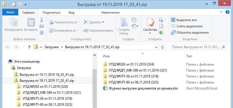 В результате выгружается ZIP-архив, в котором для каждого выгруженного документа создается отдельная подпапка и содержится отчет о выгрузке:
