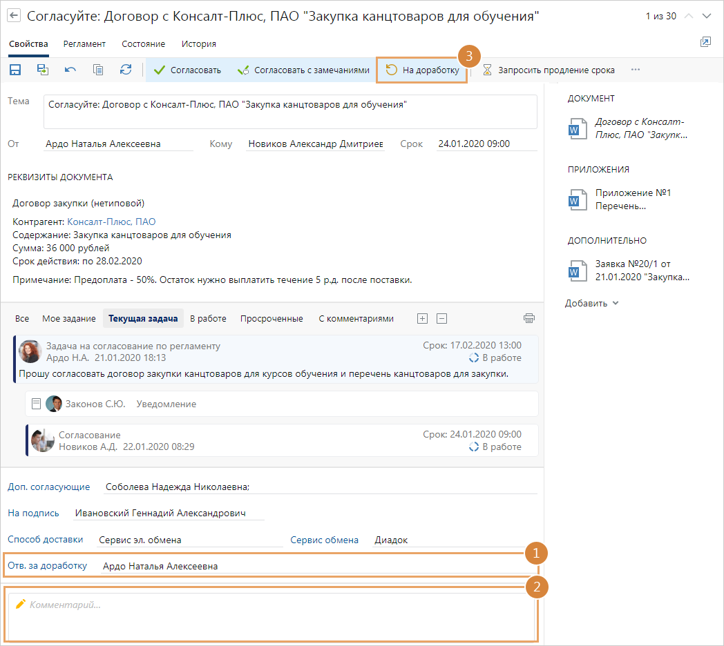1.В карточке задания в поле Отв. за доработку укажите сотрудника, которому нужно отправить документы на доработку. В списке для выбора доступны все сотрудники, принимающие участие в задаче на согласование по регламенту.