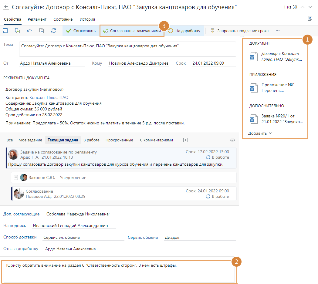 При согласовании по регламенту сотрудники могут оставлять замечания к документу, на которые обязательно должны обратить внимание следующие участники согласования и дать свои комментарии. Например, руководитель инициатора заметил, что в некоторых пунктах договора установлены штрафы и хочет, чтобы юрист обратил на них внимание на своем этапе согласования. В таком случае можно согласовать документ с замечаниями.