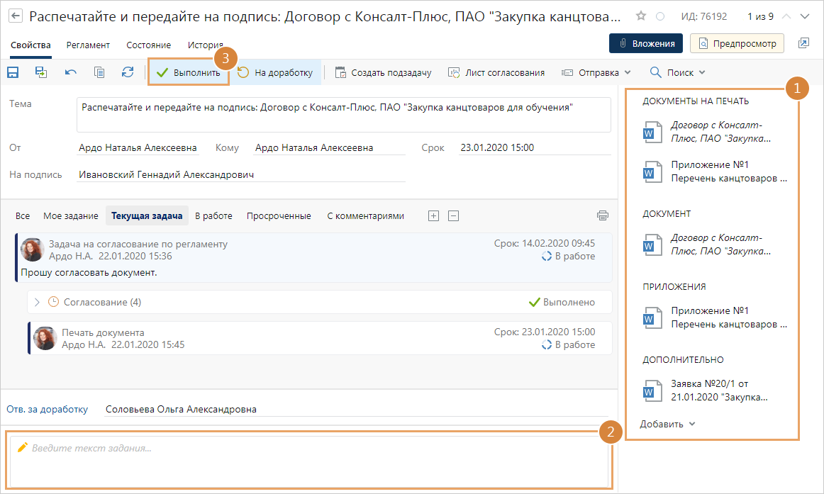 2.Отнесите все распечатанные документы на подпись или на рассмотрение, после этого заполните текст задания.