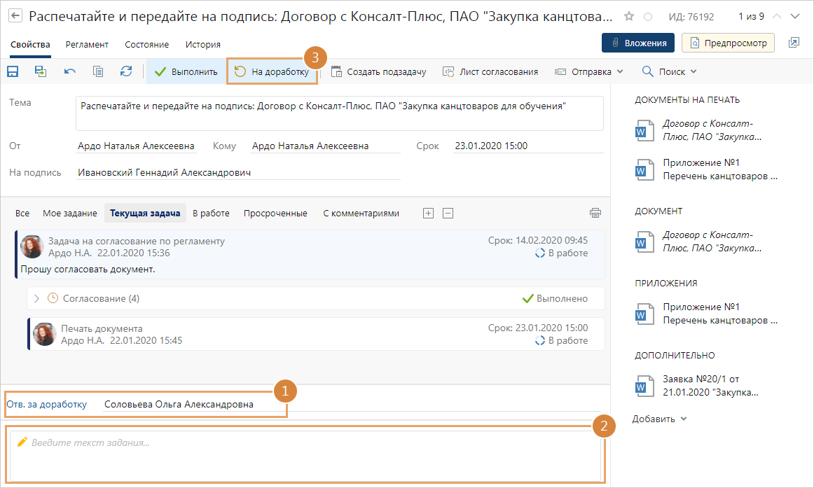 1.В карточке задания в поле Отв. за доработку, укажите сотрудника, которому нужно отправить документы на доработку. В списке для выбора доступны все сотрудники, принимающие участие в задаче на согласование по регламенту.
