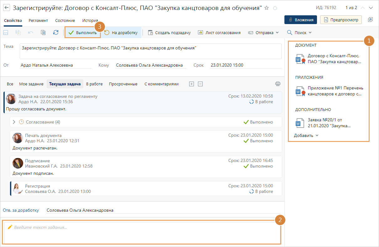 1.Откройте карточку задания на регистрацию и из области вложений откройте карточку документа, который необходимо зарегистрировать. Изучите инструкцию к заданию, если она есть. Зарегистрируйте документ.