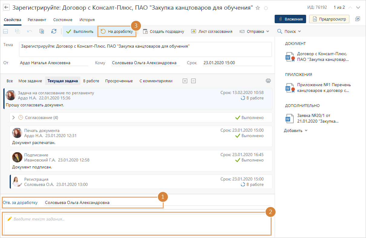 1.В карточке задания в поле Отв. за доработку, укажите сотрудника, которому нужно отправить документы на доработку. В списке для выбора доступны все сотрудники, принимающие участие в задаче на согласование по регламенту.