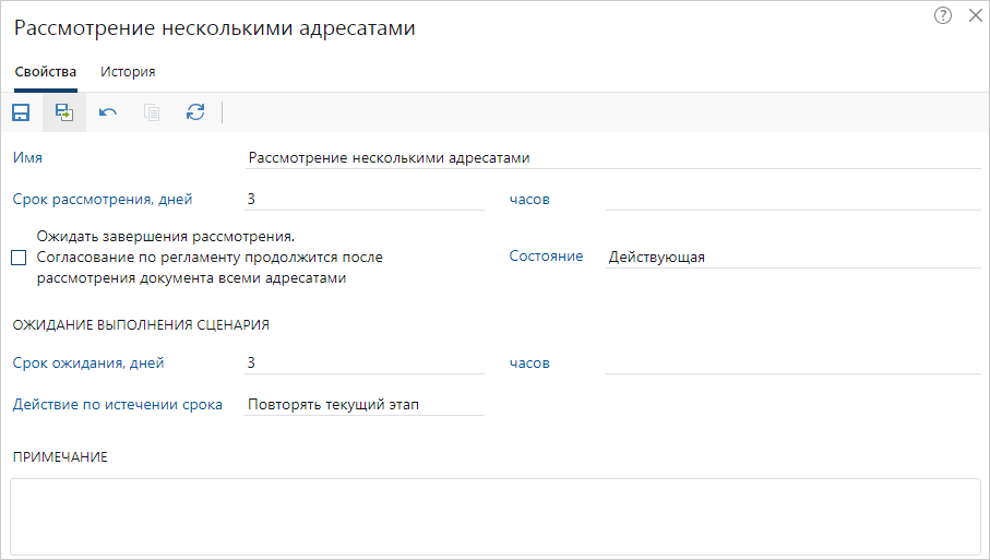 Сценарий «Рассмотрение несколькими адресатами» включает в себя: задание помощнику на подготовку проекта резолюции, задание на рассмотрение адресатом, задание на создание поручений и уведомление о завершении рассмотрения.